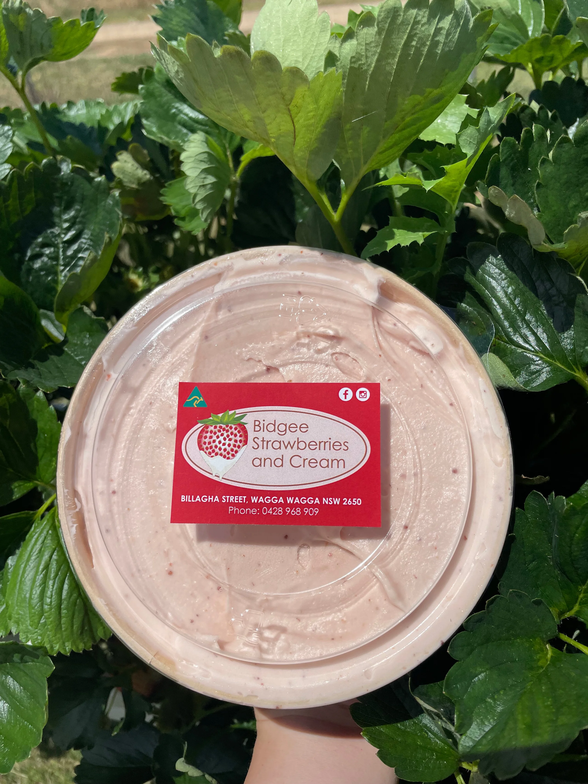 Real strawberry ice-cream ! made from Bidgee Strawberries and Cream very own strawberries and with local milk and cream. This homemade ice cream tastes like your visiting your childhood, no artificial flavours or colours !