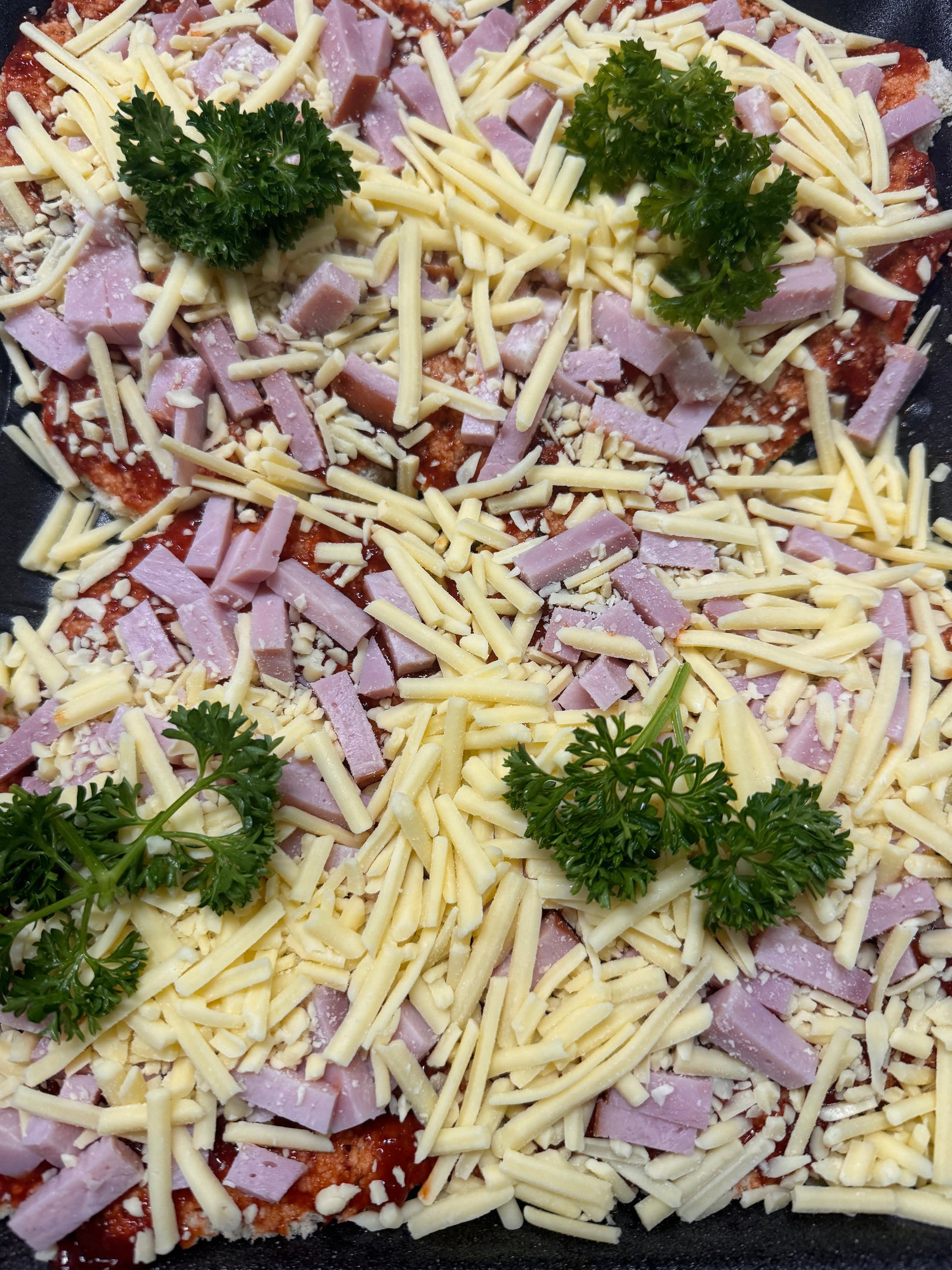 Chicken breast Parmi topped with Shredded ham, Parma Sauce and mozzarella cheese