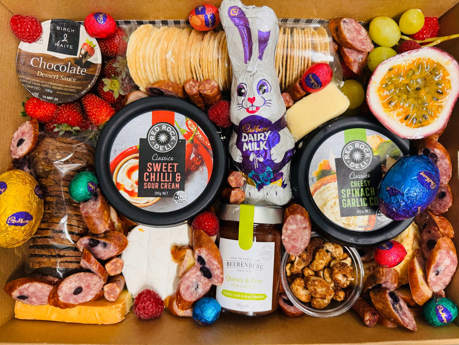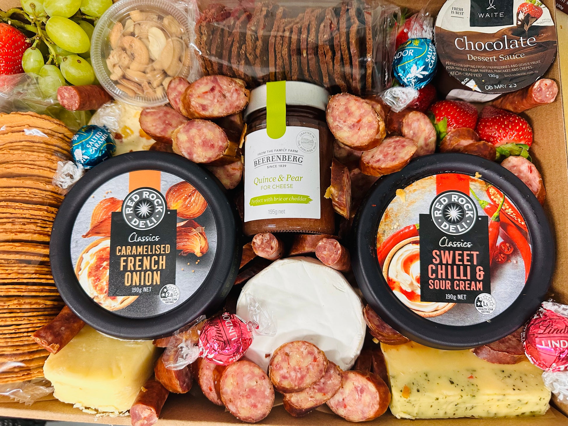 Medium size grazing box filled with crackers, nuts ,assorted cheese, quince and pear paste, fruit, dips and our instore made award winning kabana and beer sticks.